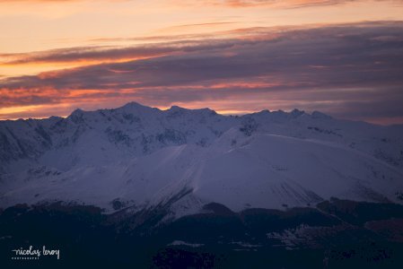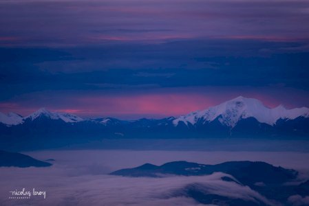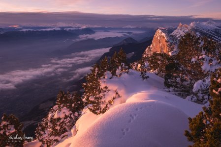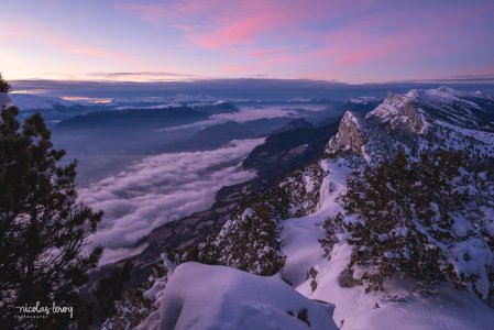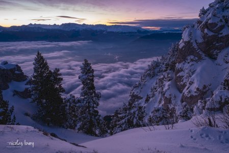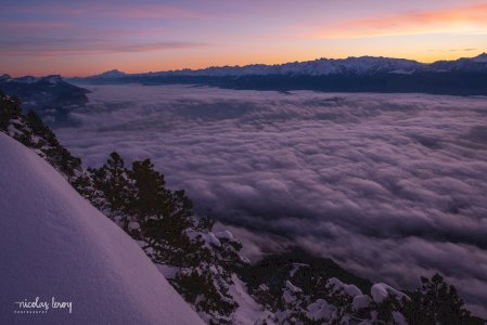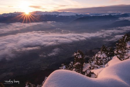 Lever de soleil depuis le Moucherotte. Surprise de voir encore la neige sur les arbres, après la douceur du week-end!