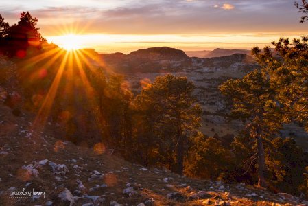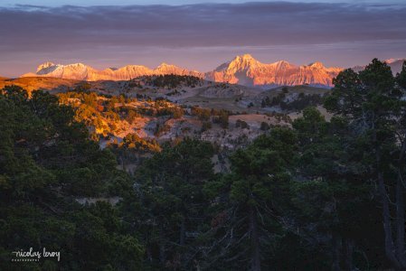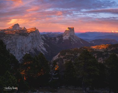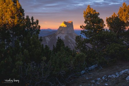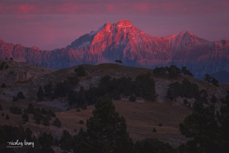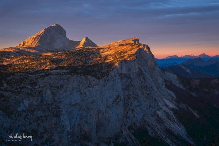 Vercors. Un coucher de soleil rare depuis la Tête des Baumiers (petit sommet qui domine le pas de l’Aiguille). Une lumière magnifique sur les Hauts Plateaux, ainsi que sur Belledonne et Obiou.